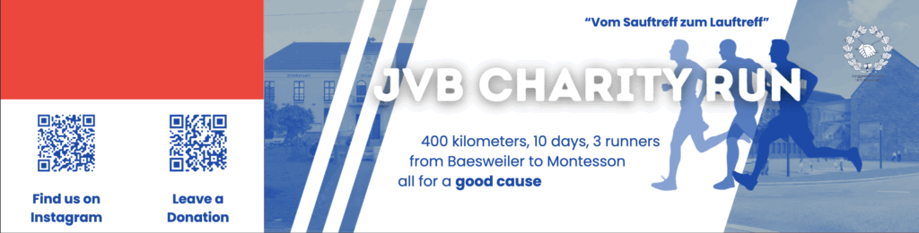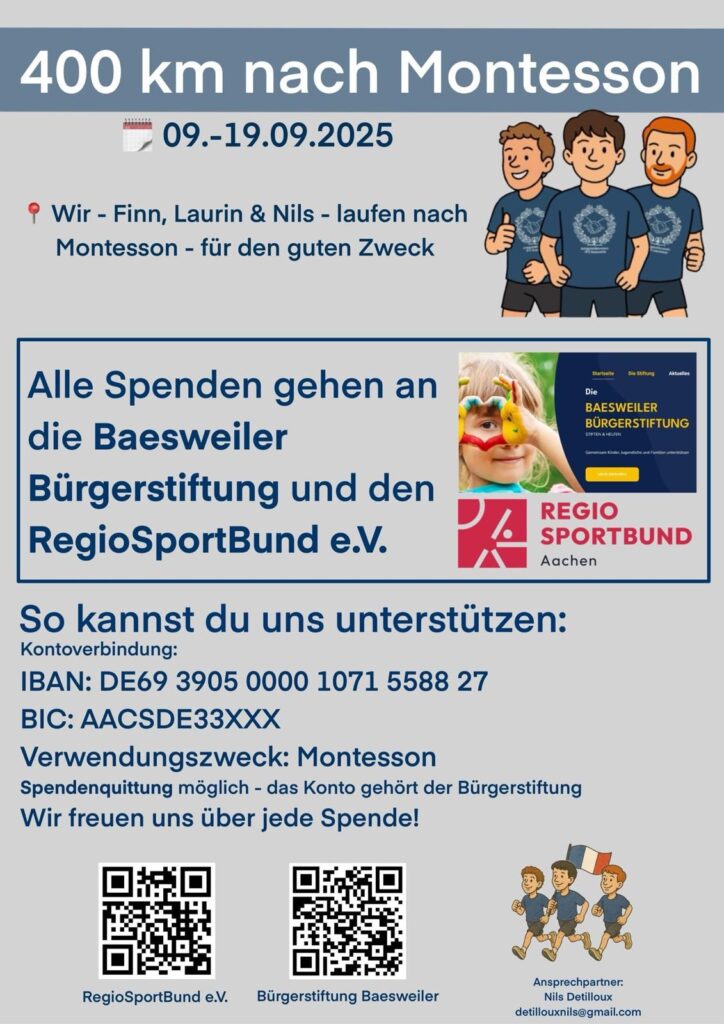 Jährlich organisiert die Stadt Baesweiler eine Fahrt zur befreundeten Partnerstadt Montesson westlich von Paris. Auch der Junggesellenverein 1872 Baesweiler ist immer mit dabei und repräsentiert im Festumzug anlässlich den Carmenfestes unsere Stadt. In diesem Jahr besteht die Partnerstadt zwischen den beiden Städten schon 35 Jahre. Aus diesem Anlass haben sich die drei Junggesellen etwas Besonderes überlegt: „Mit einem Spendenlauf wollen wir für den guten Zweck auf unsere Freundschaft zu den Franzosen aufmerksam machen“, sagen sie. Die gesammelten Spenden gehen an den Regiosportbund, der zum Beispiel Schwimmlernkurse für Kinder organisiert, die Bürgerstiftung Baesweiler und einen Verein aus Montesson.